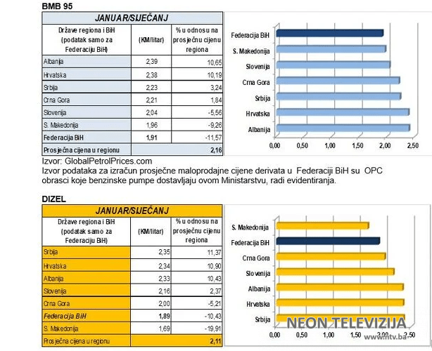 Tekst se nastavlja ispod oglasa. Najskuplje je benzin kupovati u grčkoj jer litar košta 1,52 evra, a skuplji je i u crnoj gori gde je za litar potrebno oko 1,29 evra, albaniji gde košta oko 1,27 evra, te sloveniji i hrvatskoj u kojima je za litar benzina potrebno izdvojiti oko 1,25 evra. Cijene autoplina kreću se, pak, od 5,62 do 5,89 kuna.